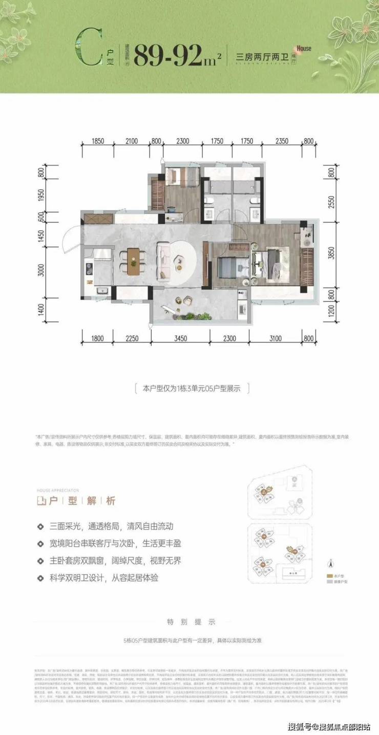 首次推首北地块1栋3单元,约80-92㎡ 3房,共195套,新规使用率高达96%-105%!
