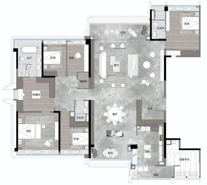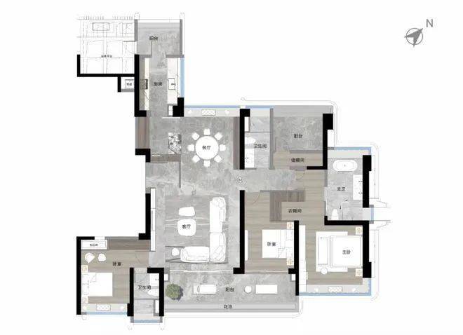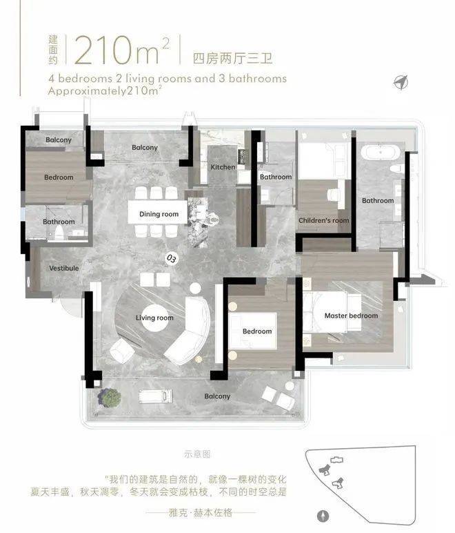 215平方米四房:南北对流、双主套设计,L型飘窗拓展空间,主卫双面采光。