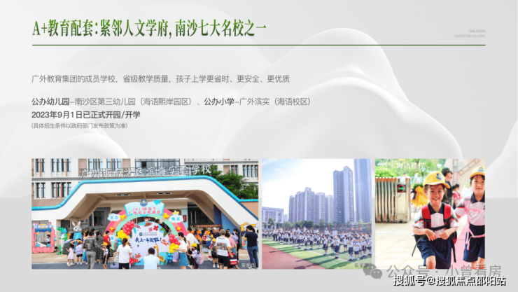 公办幼儿园-南沙区第三幼儿园(海语熙岸园区)、公办小学-广外滨实(海语校区)2023年9月1日已正式开园/开学(具体招生条件以政府部门发布政策为准)。