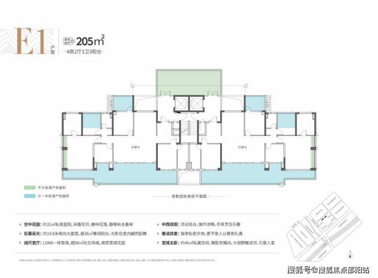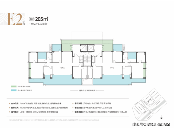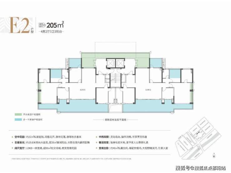 比如建面约205平4房(E2户型),不仅拥有一个约36平的阔绰阳台,还有一个约32平的专属庭院,可以在大平层实现庭院生活理想。