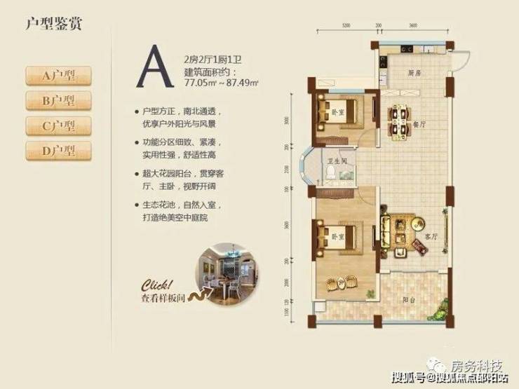 A户型 两房两厅一厨一卫 建筑面积为77.05-87.49㎡