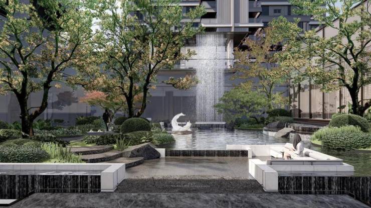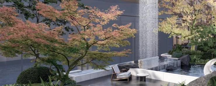 项目特邀全球顶尖团队——POWER5雕琢园林,上游打造“一脉十园”东方精奢园林,下游定制约600平琉璃光苑,更引约10米巨幕飞瀑吞吐其中。