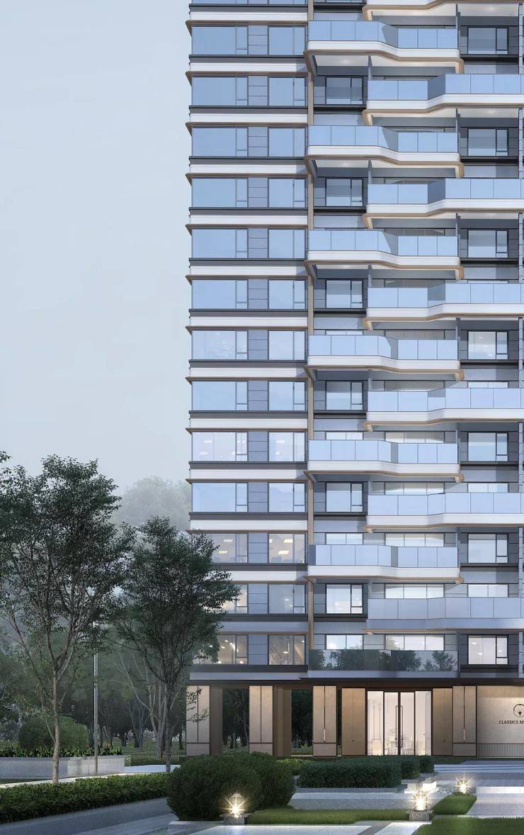 楼栋立面弧度设计取意岐江波纹,行云流水,搭配LOW-E晶钻玻璃和香槟金线条,阳光下如“鎏金烁银”,夜幕中则璀璨流光。