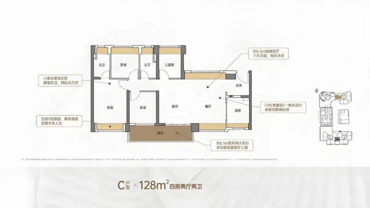 竖厅格局,客厅3.5米开间,LDKB一体化,S墙设计预留冰箱卡槽位,客厅连接次卧出5.9米长的大阳台,主卧双面飘窗,次卧270°转角飘窗,全屋6面飘窗,U型厨房,卫生间干湿分离。