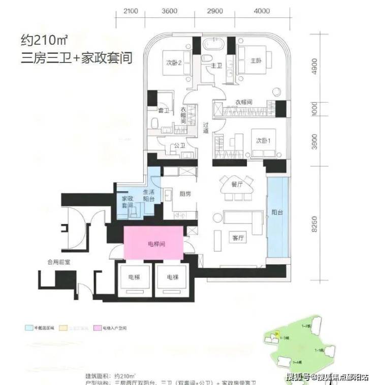 分布:D座和E座,3梯2户,专梯入户,弓形结构,家政套间与采光面设计为亮点,但弧形阳台尺度感一般。
