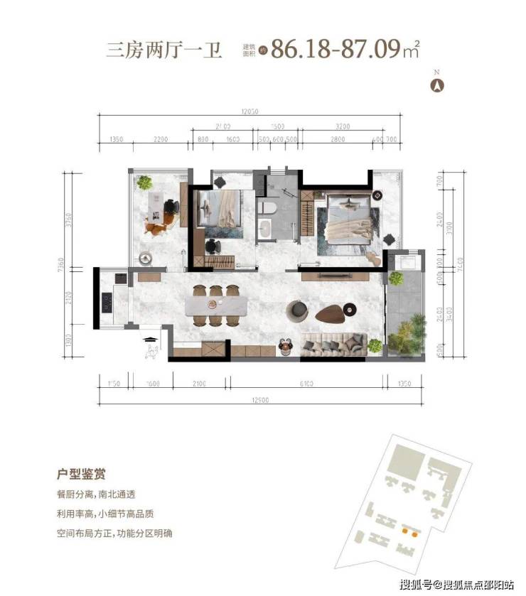 三房两厅一卫 建面约86.18-87.09㎡