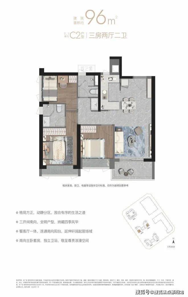 【C2户型96㎡三房两厅两卫】“方正全明南向三房”,格局方正,围合设计
