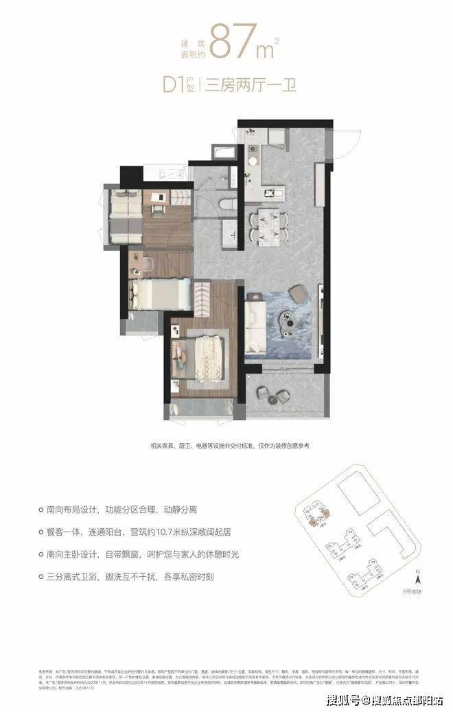 ✨✨塘城壹号花园售楼处电话:400 9616 219【☎售楼处已认证】❇❇❇❇✨✨塘城壹号花园开发商电话:400 9616 219【☎开发商已认证】❇❇❇❇【D1户型87㎡三房两厅一卫】“10.7 m纵深紧凑南向三房”,10.7 m纵深餐客一体,通风采光极佳