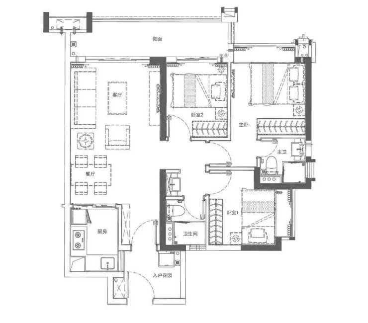 建面约86㎡南北通透三房,南北对流,采光通透,空间视野开阔,布局方正舒适实用,客厅直通南向阳台,引更多清风和阳光入室,缔造质感生活。