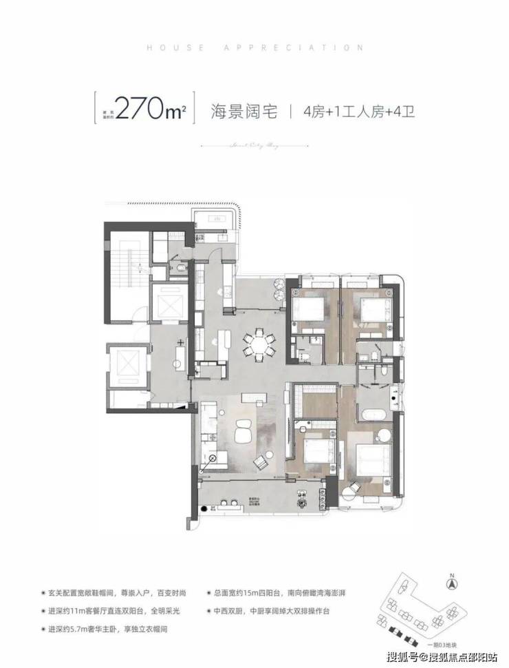 项目包含住宅、公寓、写字楼、酒店、商业、教育、公园等多种业态。目前在售的是一期的03地块由4栋住宅和2栋公寓组成,占地面积 21889.28㎡,建筑面积约16.8万㎡,容积率约8-9,车位比1:1.3;即将加推的二期是由2栋住宅+商业+办公组成。