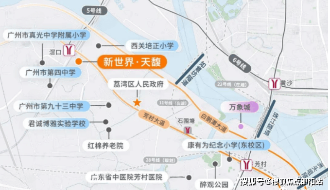 新世界天馥扎根荔湾区滘口板块,紧邻白鹅潭 CBD。白鹅潭这地儿可不简单,作为广州 “西翼 CBD”,承载着城市发展的厚望,左手牵珠江新城,右手拉广钢新城,脚下是千年商都的根基,规划投入高达约 3000 亿,超 100 个重点项目纷纷落地,未来潜力巨大。而新世界天馥直接占据白鹅潭核心区域,周边 500 米范围内,硬核配套满满当当。