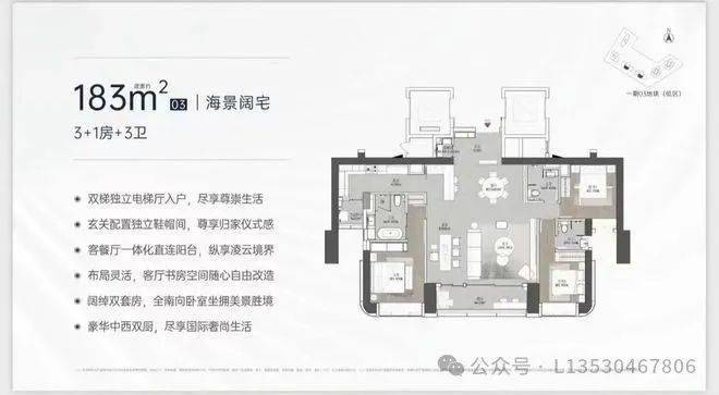 183㎡的4房2厅3卫,双梯独立电梯厅入户;西南向,有一个公卫是没有窗户的。位于5-25层,价格1900-2300万。