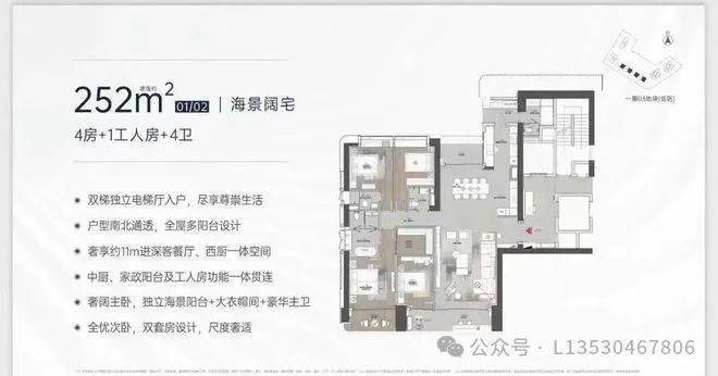 其中252/253㎡4房+1保姆房+4卫,双梯专属电梯厅入户,南北通透的客餐厅、中西厨直连南北双景观、双开间大阳台;配置阔绰五阳台—客厅、次卧海景双阳台、主卧专属海景大阳台、北侧园景阳台、家政阳台一应俱全,居然合计有近15米的阳台开间。位于5-25层,2500-3000万。