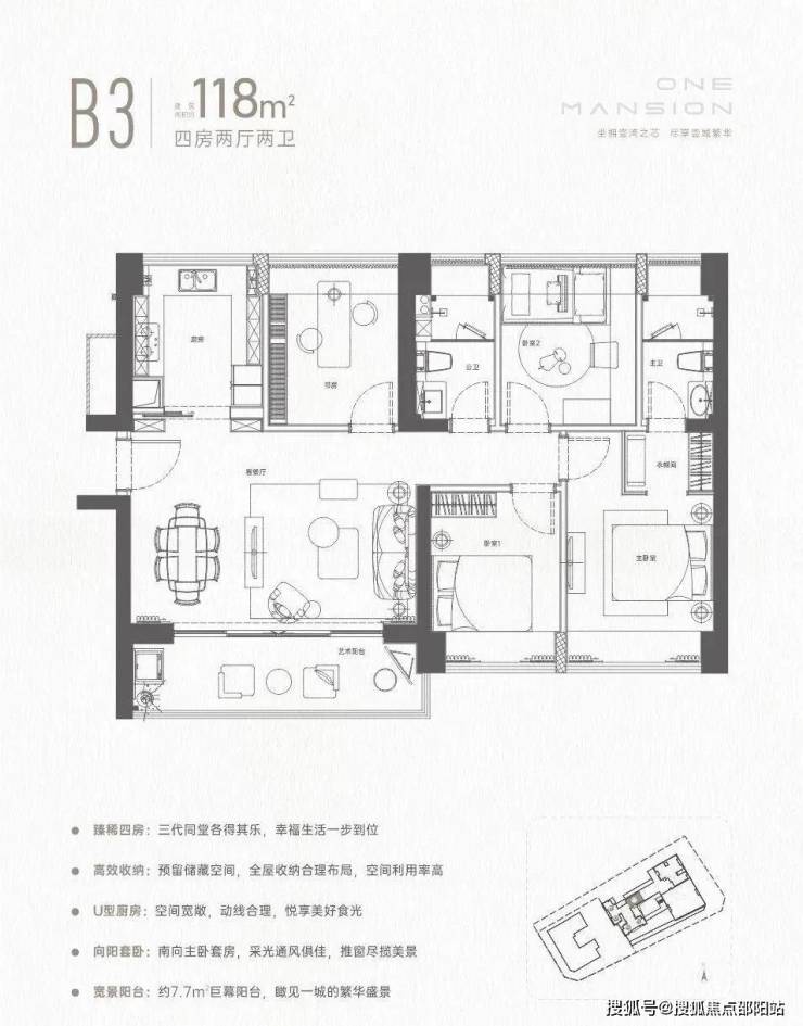 118㎡的4房2厅2卫,设计的横厅南北通透格局,客餐厅4.2米开间,全屋飘窗设计,四开间朝南,4个卧室分别做到了3.2米/2.9米/2.9米/2.7米的宽度,U型厨房,约7.7米长超大阳台,得房率72.47%(不含赠送),阳台主朝东南朝向。
