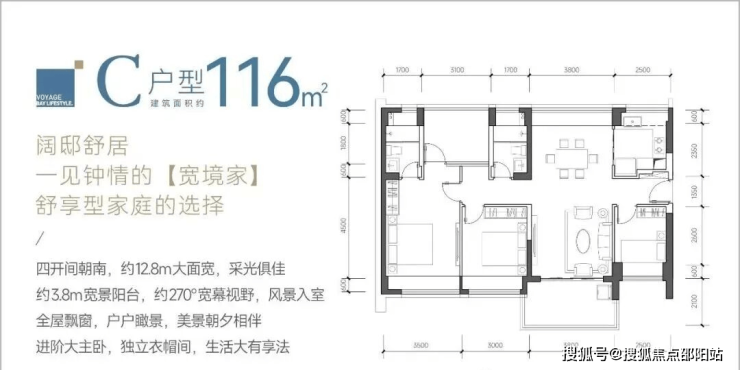 116㎡的4房2厅2卫,C户型,设计的是竖厅南北通透格局,餐客厅一体化设计,客厅3.8米开间,四开间朝南,4个卧室分别做到了主卧17.85㎡/次卧11.4㎡/次卧9.3㎡/次卧8㎡(包含墙体飘窗),都不用搭配飘窗做床,U型厨房,卫生间干湿分离,得房率约:93.13%(包含赠送),阳台主朝西南、东南或正南向。