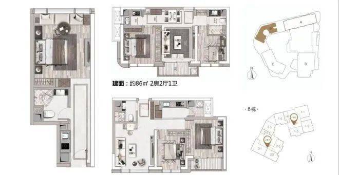 B座产品:47-85-92-115-125㎡ 1-3房云端美寓