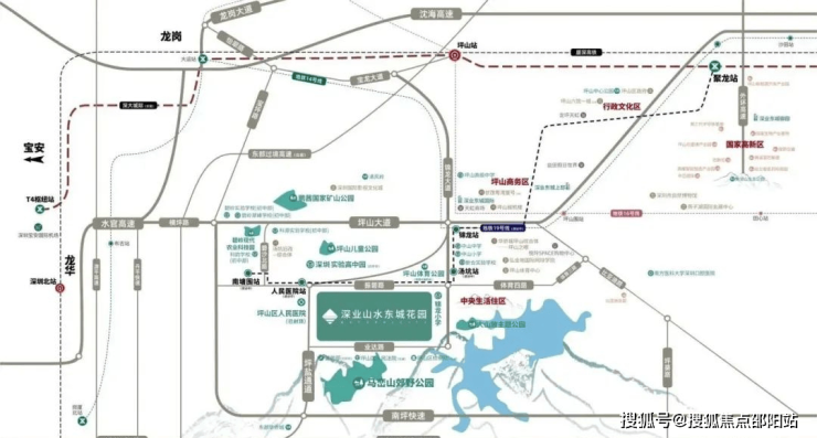 坪山销冠项目,位于坪山碧岭板块,项目名称「深业山水东城」,距离地铁14号线锦龙站直线距离1.5公里,在建19号线坪山人民医院站约600米(直线距离)。