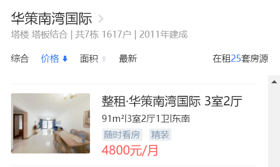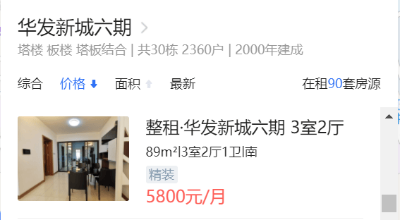 以南屏商都上盖的华发新城六期为例,89㎡户型月租金最高达5800元/月,对比周边项目同一面积最高租金,足足高出了1000元/月。(数据源:贝壳找房)