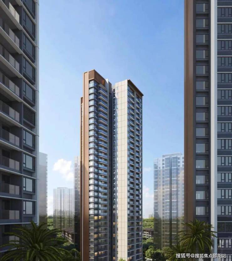 项目采用中央大园林围合式布局,紧密围绕景观大空间半围合布局,建筑以深咖色铝合金、米黄色真石漆及深灰色涂料打造现代典雅风格立面, 通过强化竖向线条的划分打造建筑高耸、挺拔的高端奢华外形。