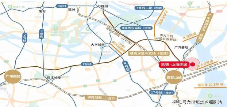 地铁交通:距离项目2.5公里处有莲花山站,佛莞肇城际已经开通运营了,3 站到长隆万博,4 站到广州南站。另外佛莞深城轨琶洲支线还在建设中,(2 站到大学城,3 站到琶洲)以及广中珠澳城轨(规划中)和8号线地铁的东延段(预计2027年通车)。