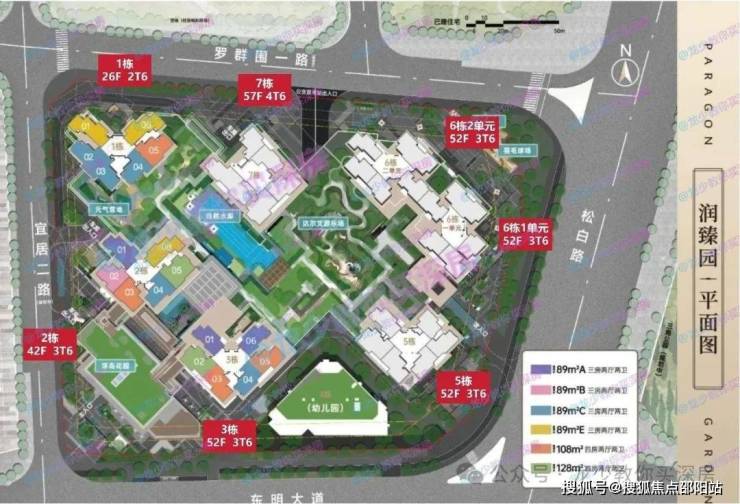 其中1栋26层,2栋42层, 3栋52层,5栋52层,6栋1/2单元52层,7栋57层,4栋规划1所9班制幼儿园。1栋2T6,7栋4T6,其他都是3T6。