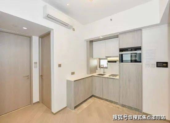 单位设开放式厨房,以浅灰色柜门饰板配上白色云石工作枱面。厨柜采L型设计,一旁延伸为窄身收纳柜。