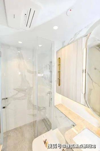 浴室以淋浴间设计,节省位置。洗手盘柜及镜柜内有不同间隔,为住户提供储物空间。另浴室亦设Panasonic浴室宝,供住户调节室内环境。