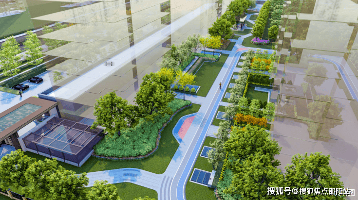項目園區呈線性佈局,涵蓋多功能草坪區、會客聚會區、樂享休閒區三大區域,融合環形健康跑道、靜思品茶區、下沉式會客活動區等功能區,打造綠意濃陰、鮮氧環繞的社區生活