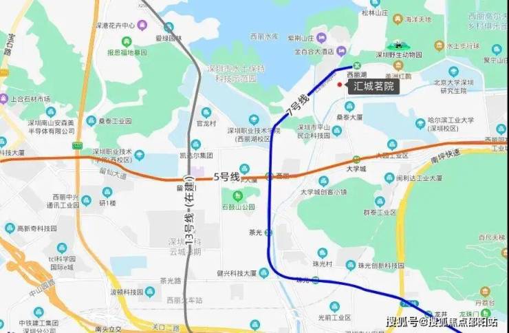 汇城茗院位于深圳市南山区西丽湖路与丽山路交汇处西南侧;距离地铁7号线西丽湖站约200米。