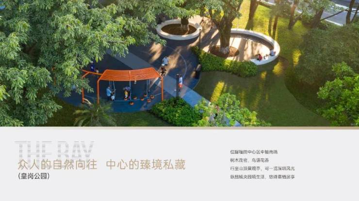位踞福田中心区中轴南侧,树木茂密,鸟语花香。行至山顶景观亭,可一览深圳风光,纵揽城央园境生活,悠诗意栖居享