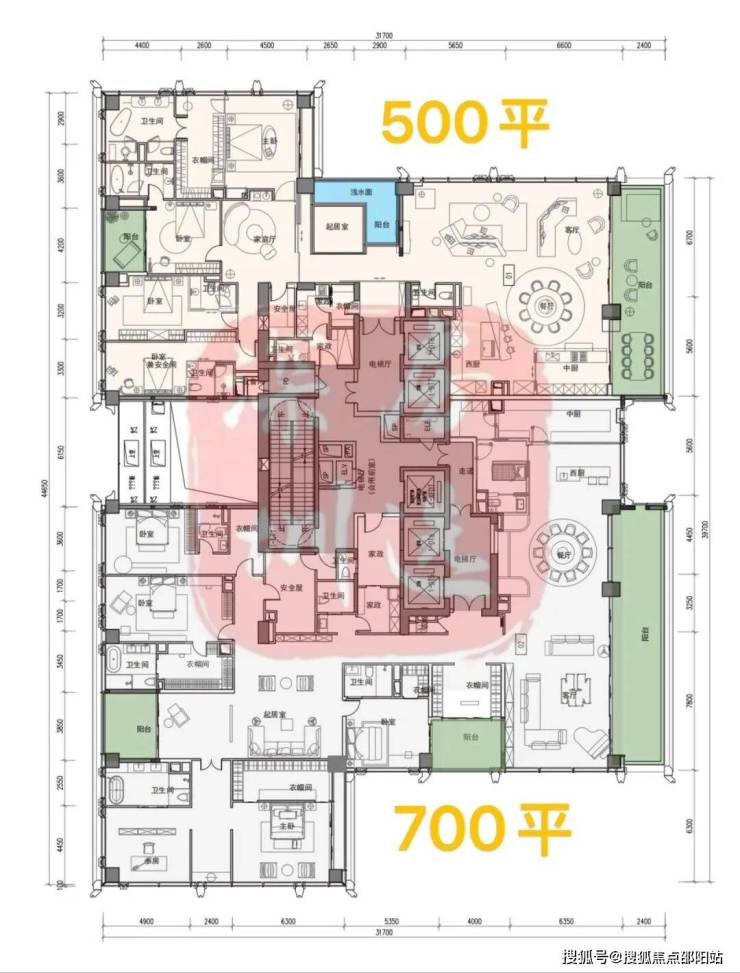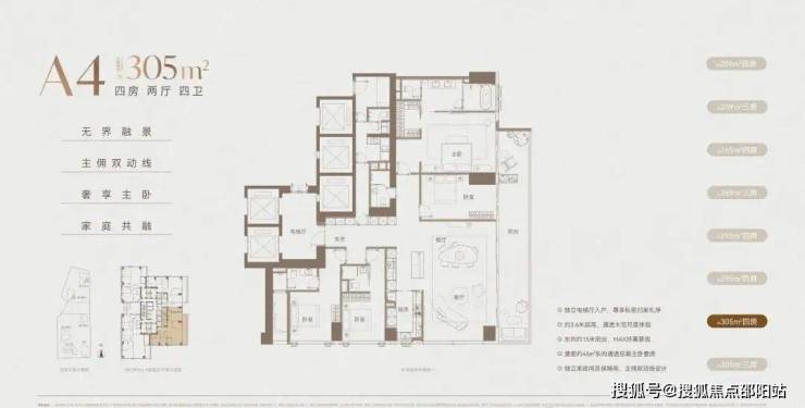 ②高区42F起(150-200米)是约370-375-403㎡4+1房五卫+家庭厅+家政套间;
