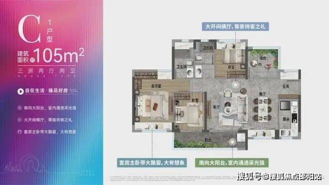 首先我们来看最受欢迎的约105㎡三房两厅两卫户型。这个户型做了大横厅设计,且五开间朝南、南向大阳台连接客厅与次卧、玄关带飘窗、主卧带南北双飘窗,都大大提升了室内采光。