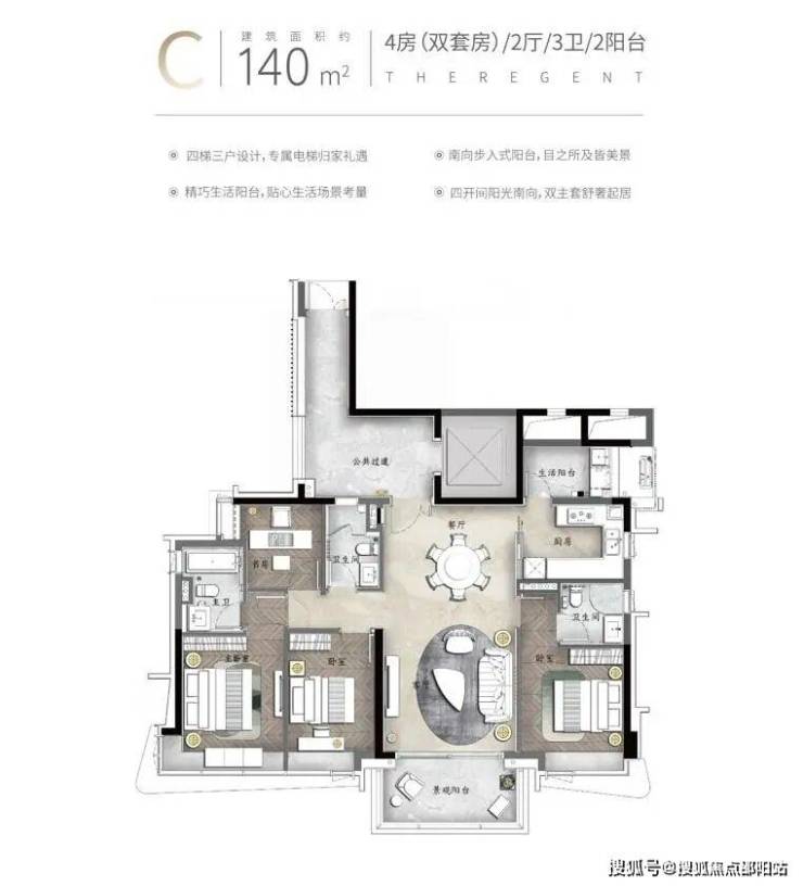 产品亮点:私家电梯入户、约3.4米层高、动静分区南北对流、约6.8米挑空餐客厅、中西双厨、三套房设计、部分房间带阳台设计