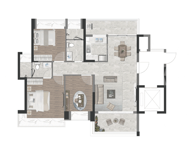 3、4、5、6栋为17层高两梯两户的稀缺板楼设计,共有2个单元,均为建面约120㎡三房户型。