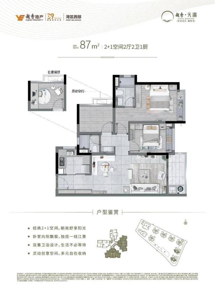 越秀·天瀛的最大亮点是其南向珠江的无敌江景,项目位于广州的核心区域,南向临江,离珠江不到30米,享有无遮挡的江景视野。项目采用低密度设计,建筑布局为半围合式,容积率为3.5,使得小区内拥有宽敞的绿化区域,营造出宜居的生活环境。该项目每栋楼的户型均为全南向设计,确保每个家庭都能享受到最优质的自然景观与阳光,真正实现“望江而居”的理想生活。