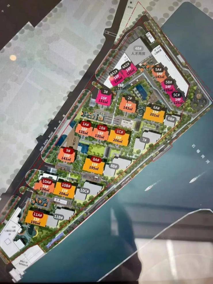由于临近军区的原因,所以朝向不是正南,而是偏西南,小区设计南低北高,东侧的临河位置由于限高15米,做了5栋4层高叠墅,西侧也是小高层15-16层设计。