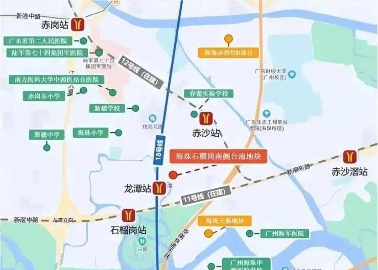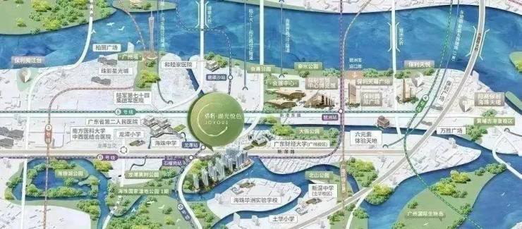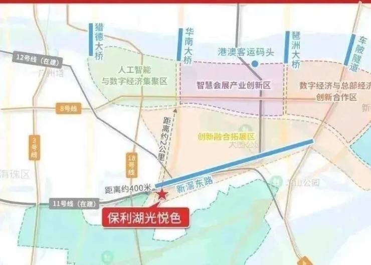 保利湖光悦色位于海珠区华洲路旁,西侧为广州海珠湿地公园,南侧邻石榴岗河,距离地铁11号线(在建)和18号线换乘的石榴岗站约600米,距离琶洲南TOD不到两公里。