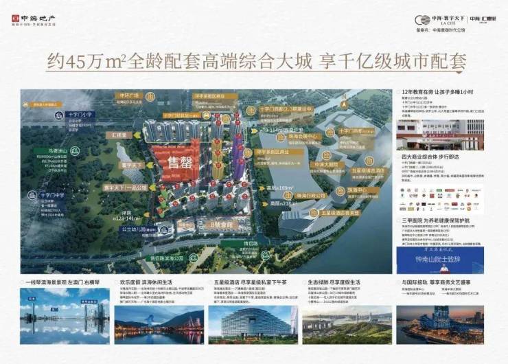 中海寰宇天下秉承与城市共美好的精工理念,择址十字门商务区打造的建面约45万㎡的海景头排大盘。寰宇天下也是全国第22座中海寰宇天下系,融入NEXT CITY LIFE全新概念,产品迭代升级,将打造成红树湾plus,再次引领珠海人居升级。