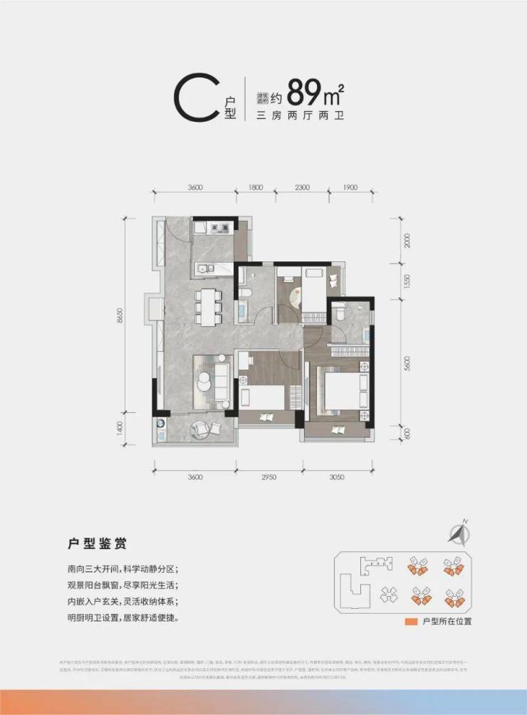 89㎡ 3房2厅2卫:三开间朝南,奢阔主卧套房