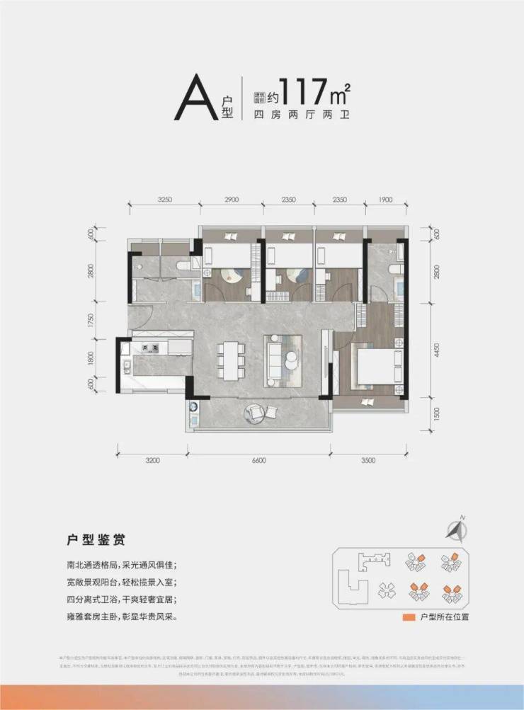 117㎡ 4房2厅2卫:稀缺南北通透、大横厅阔绰4房,约6.6米阔景阳台 ,四分离卫生间