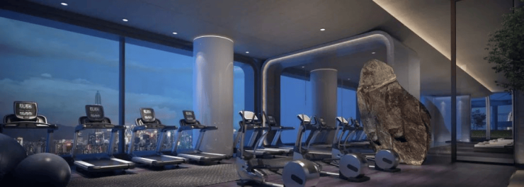 项目在150米高空打造的横跨3栋楼的云端会客厅,正面饱览银湖山、笔架山的绿意葱茏,景观无敌。这个会客厅面积约6000㎡,由云端会所+休闲绿化平台组成,其中云端会所设有私人宴会厅、山景健身中心、无边恒温游泳池、瑜伽房等场所,引入的都是高端品牌,提供的都是星级酒店会所服务