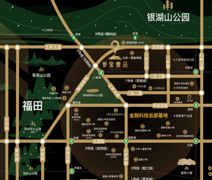 尽享自然景观与城市景观,北侧靠福田“大靠山”塘朗山山脉的银湖山,西侧靠近笔架山公园、深圳市体育中心以及南北贯穿福田的环中心公园,西南可以遥望繁华的福田中心区及平安大厦,东南遥望罗湖CBD。