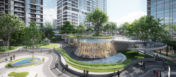 天工园林——约36000㎡五重立体园林设计,园林设计由全球最大的景观与规划设计公司AECOM设计,创新的引入了新加坡森林城市立体园林的概念,由下而上通过曲线的绿化、铺地、浅水等表达“山之叠嶂、绿之叠翠、水之叠灵、云之叠景”的意境。