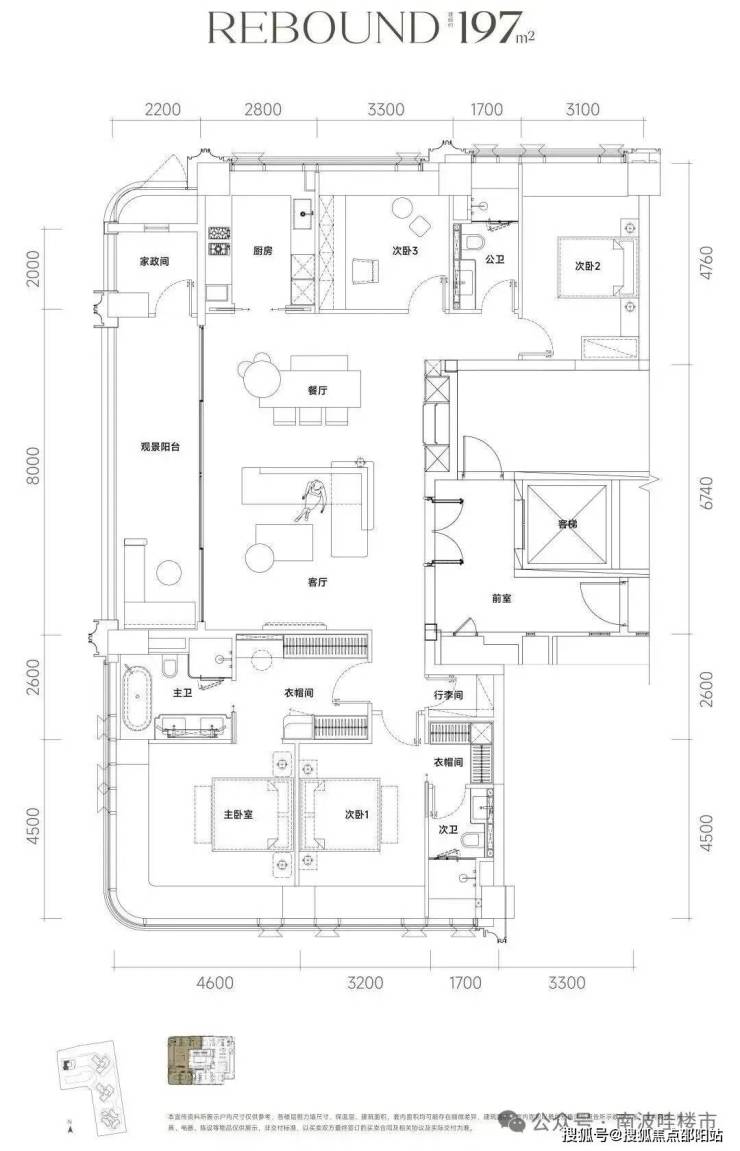 约197㎡ 四房三卫两厅、三面采光、主卧套房、270°转角奢华空间全景落地窗。