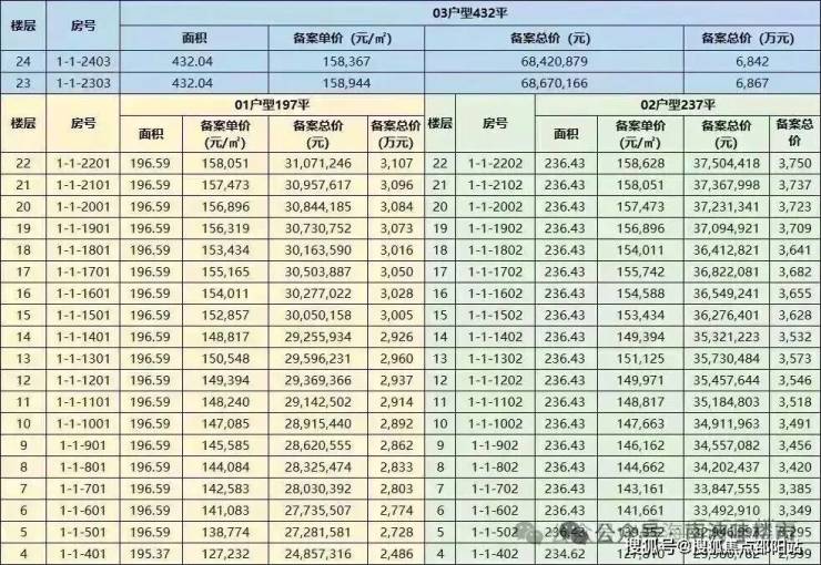 备案单价12.7-15.9万/㎡,总价2999-3750万。另有两套432㎡大平层,总价6842-6867万。