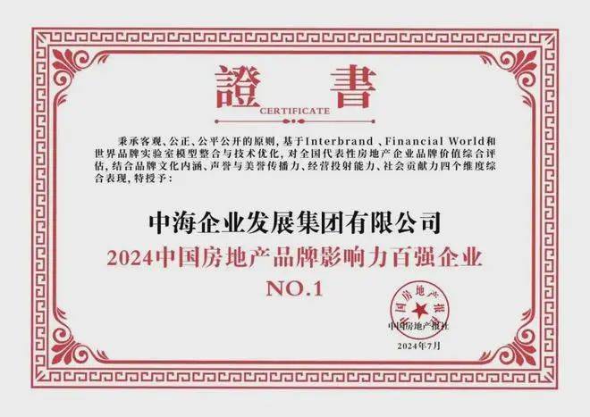 2024年3月中指研究院发布中国房地产企业销售排行榜TOP100,中海地产的各项数据指标均名列第一,中海地产“2023中国房企交付力第一名”。2024年7月荣获“2024中国房地产企业品牌价值百强企业第一名”,还获评“2024 中国房地产品牌社会贡献力企业”殊荣。(数据来源:中国房地产报联合专业房地产品牌测评机构)