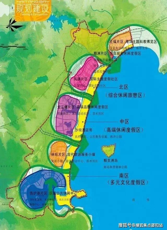 海棠湾以“一点一带三区六片五楔”为规划,“一点”为蜈支洲岛,“一带”即沙坝地带;“三区”即南、中、北三个区(南区:南起铁炉港,北至国家海岸大道;中区:包括大小龙江塘和指状湿地范围;北区:包括藤桥、椰洲、风塘等多个场地单元;);"六片"即六个主要功能片区(包括铁炉港片区、林旺片区、龙江塘片区、风塘片区、椰洲片区和土福片区)。“五楔”即是各个功能片区被生态绿地所包围,五条主要生态绿楔顺应山势从中部穿过,直通海滨。