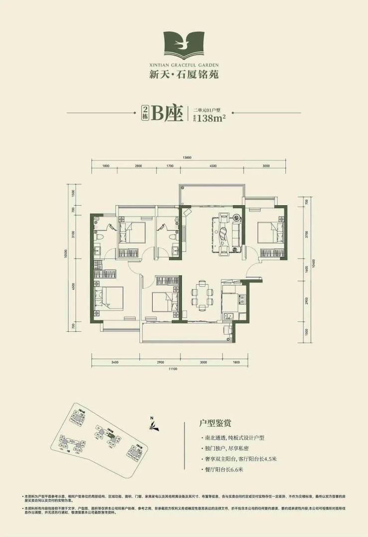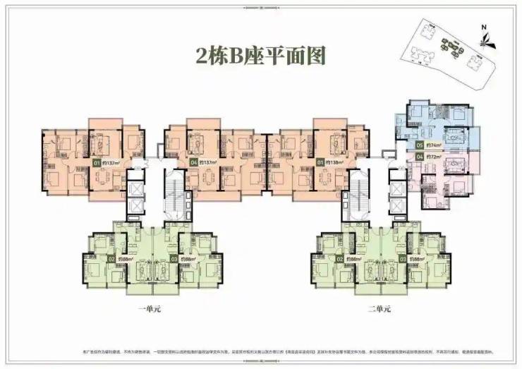 🔹2栋B座一单元01、04户型、2栋B座二单元01户型:面积约为137-138㎡的4房2厅2卫;