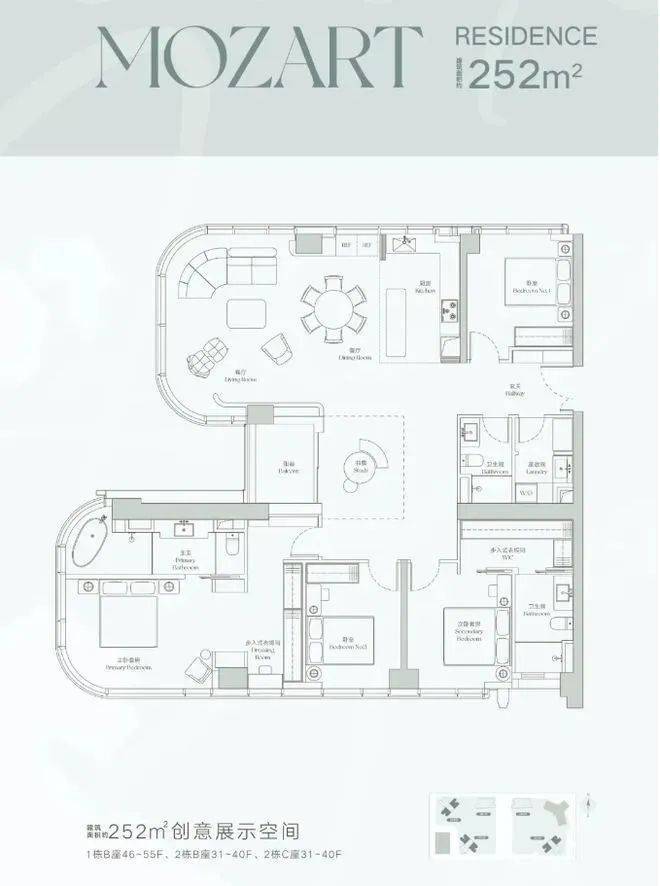 252平4+1房3卫,货量最多的户型,带独立电梯厅,4梯3户,共207套。客厅双面采光,有6条腿可选。