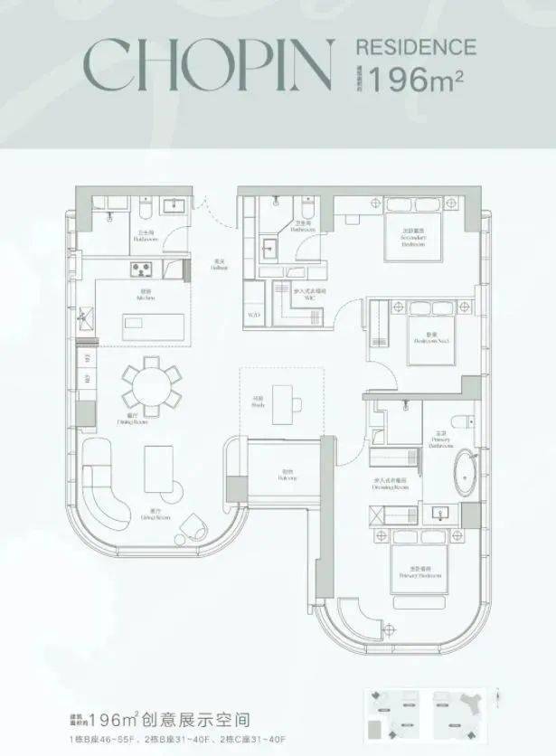 建面约196平户型「三居室+灵动空间+三卫」的奢阔设计,让生活更加从容且惬意,匹配对生活有追求的商务精英或高净值人群的居住需求。